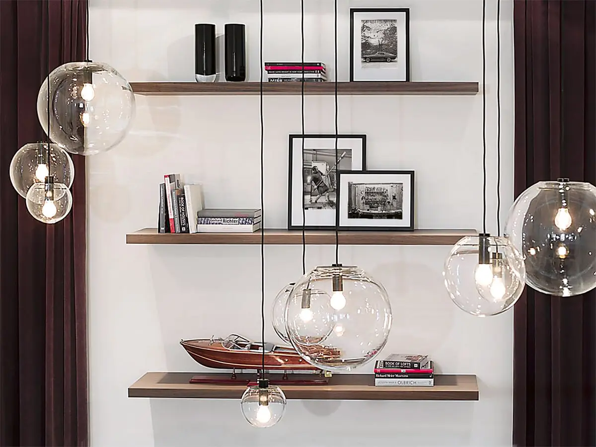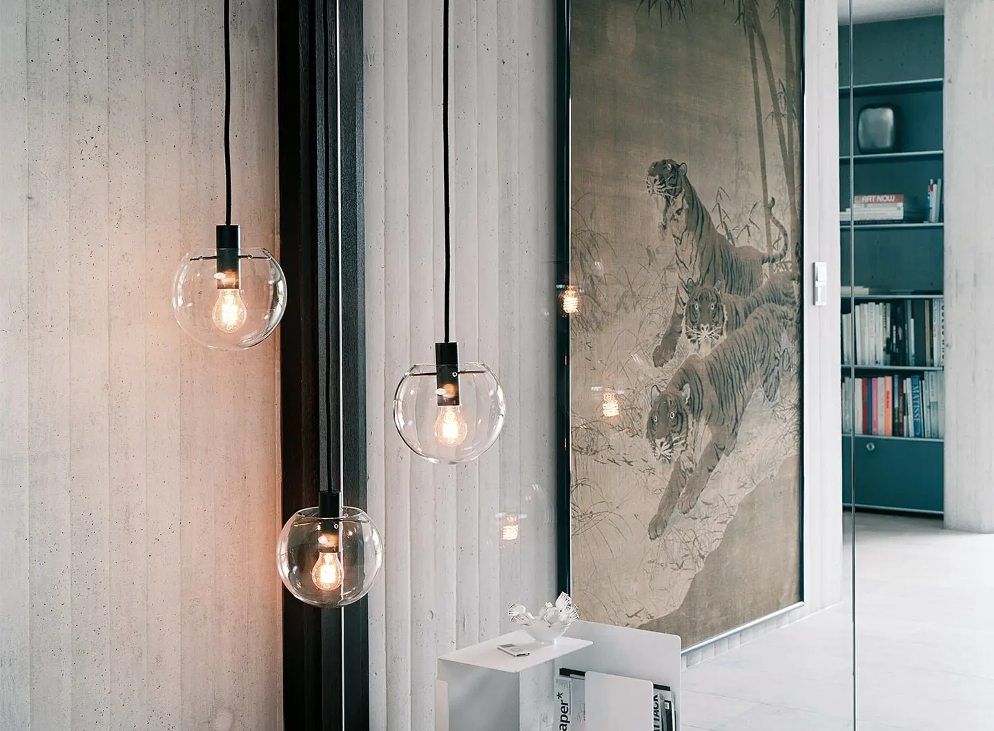 Each of the spheres of the Selene lamp series is hand-made and hand-blown. A process that has not changed over the course of centuries and requires enormous, masterful skills. Reflexions and movements in the glass provide Selene with its special brilliance and vividness. A simply cylindrical socket changes the character of the lamp through varying materials. Alone or in a group suspended in different sizes, Selene offers plenty of design freedom.