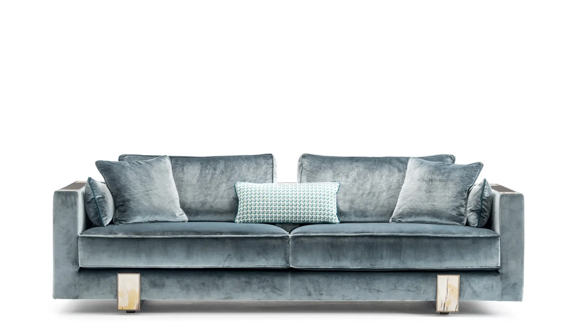 L'imbottitura in poliuretano espanso a quote differenziate, piuma d'oca e memory foam garantisce un comfort assoluto. I volumi invitanti e sospesi poggiano su quattro eleganti piedi in corno opaco e ottone brunito, dall’impatto visivo accattivante. Il divano è disponibile in dimensioni e finiture personalizzabili e si adatta perfettamente a molteplici soluzioni d'arredo.