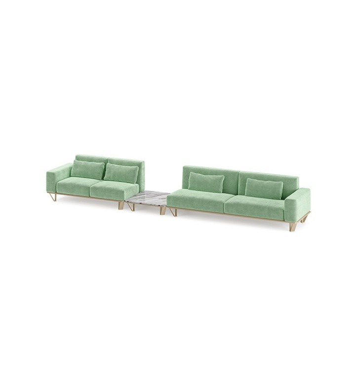 Nella serie di imbottiti componibili Futura dalle forme morbide e generose, la linea di base in metallo unisce le parti imbottite interrotte con piani in marmo. I piedi rendono leggera l'immagine delle composizioni.