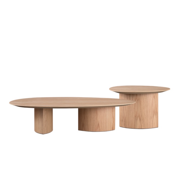 Tavolino da caffè con top organico e caratteristiche gambe "a foglia" realizzato in legno, con top nella stessa essenza, in gres porcellanato o marmo.
