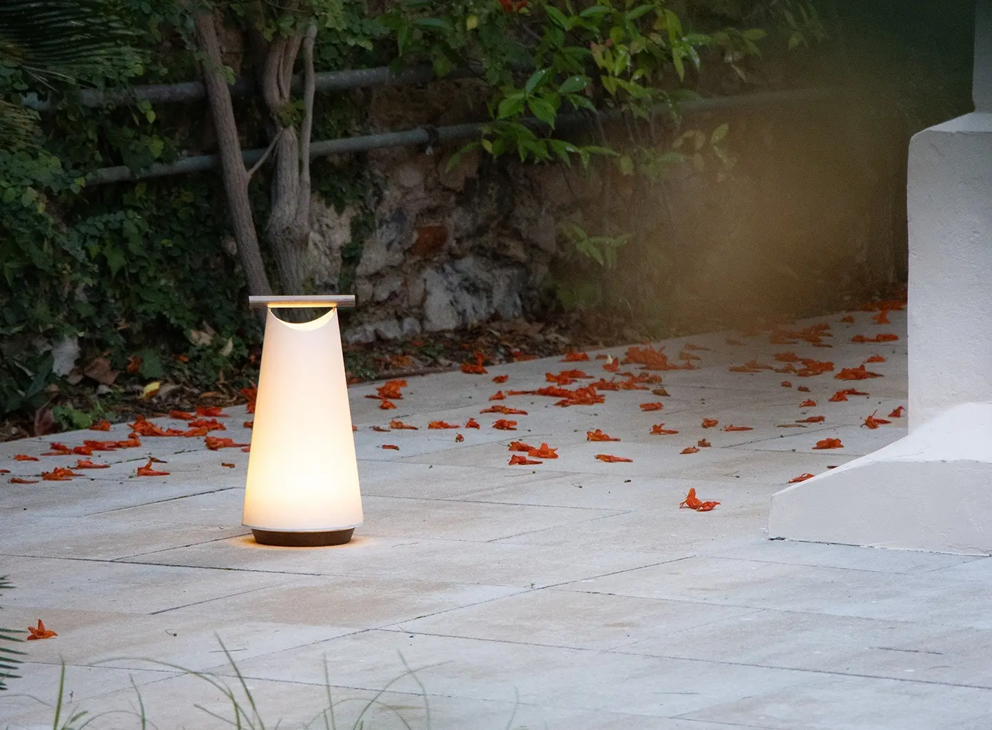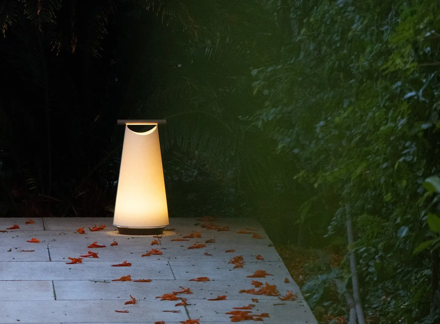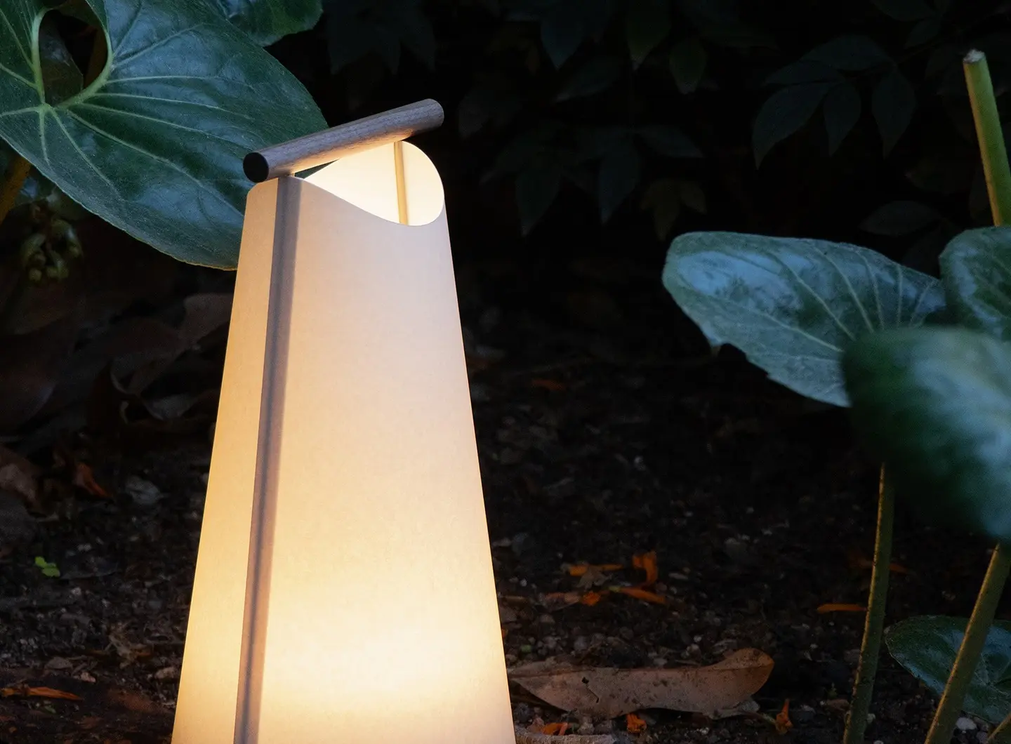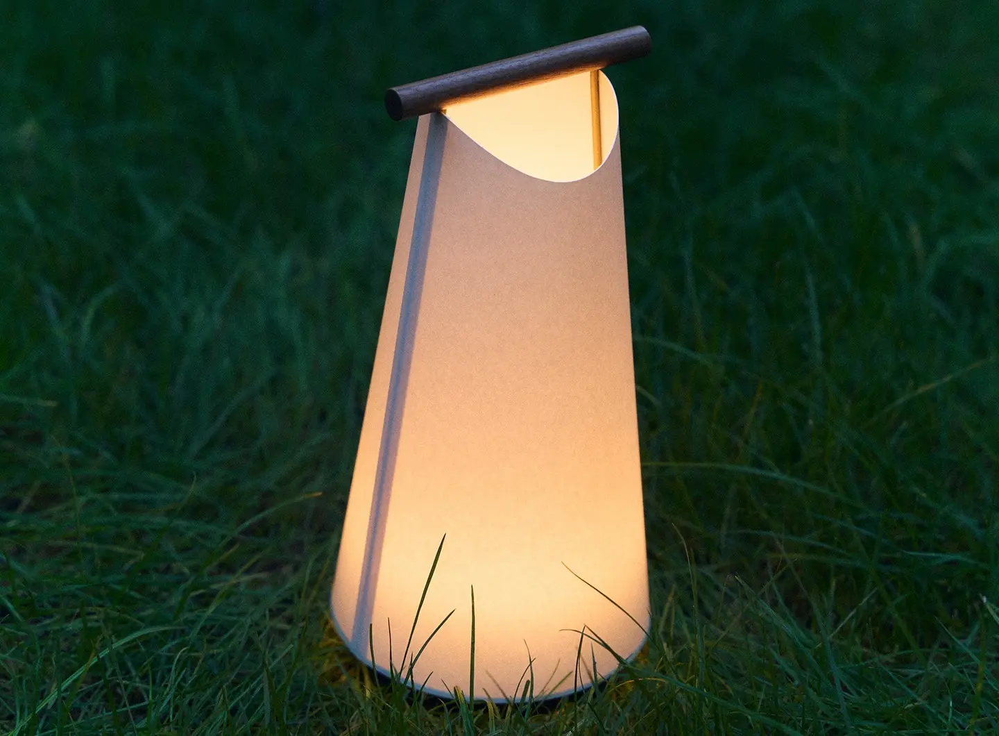 L’accurata selezione dei materiali e il modulo LED IP65 garantiscono protezione dalle intemperie. La maniglia in legno di iroko e il paralume in PVC permettono alla lampada di adattarsi a spazi esterni, da terrazze a ristoranti.